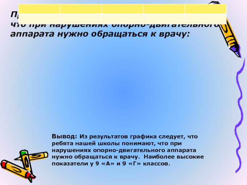 Вывод: Из результатов графика следует, что ребята нашей школы понимают, что при нарушениях опорно-двигательного аппарата нужно обращаться к врачу. Наиболее высокие показатели у 9 «А» и 9 «Г» классов.