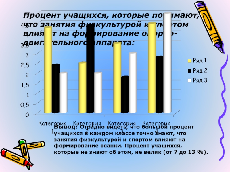 Вывод: Отрадно видеть, что большой процент учащихся в каждом классе точно знают, что занятия физкультурой и спортом влияют на формирование осанки. Процент учащихся, которые не знают об этом, не велик (от 7 до 13 %).