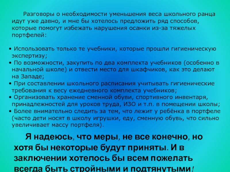 Я надеюсь, что меры, не все конечно, но хотя бы некоторые будут приняты. И в заключении хотелось бы всем пожелать всегда быть стройными и подтянутыми!