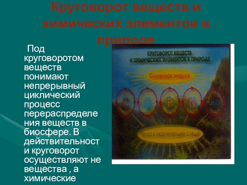 веществ понимают непрерывный циклический процесс перераспределения веществ в биосфере. В действительности круговорот осуществляют не вещества , а химические элементы.