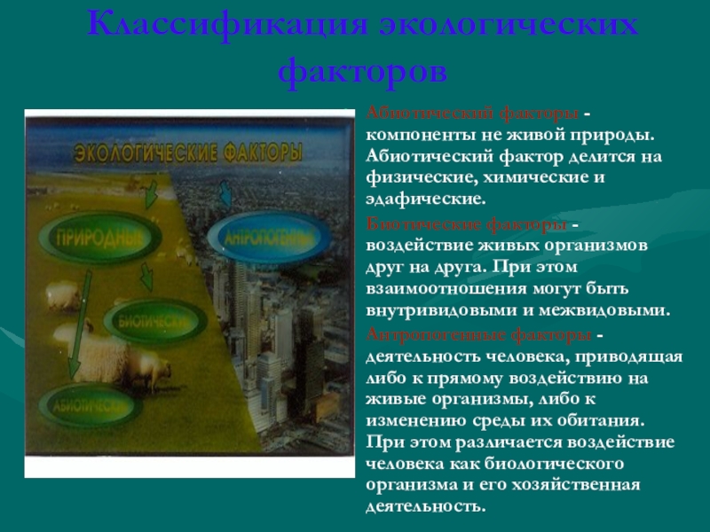 Антропогенные факторы -деятельность человека, приводящая либо к прямому воздействию на живые организмы, либо к изменению среды их обитания. При этом различается воздействие человека как биологического организма и его хозяйственная деятельность.