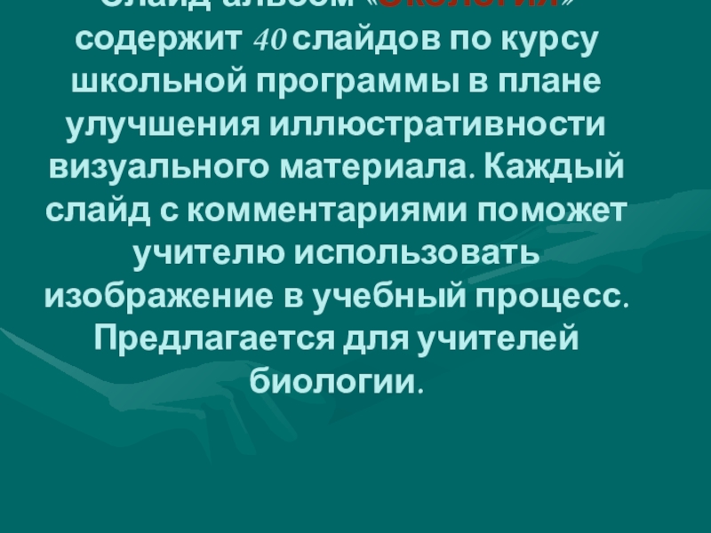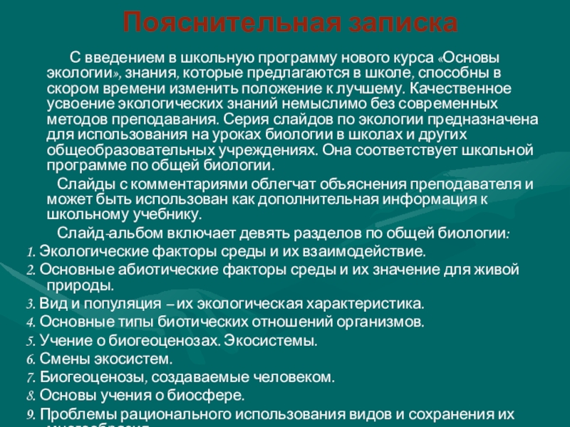 экологии», знания, которые предлагаются в школе, способны в скором времени изменить положение к лучшему. Качественное усвоение экологических знаний немыслимо без современных методов преподавания. Серия слайдов по экологии предназначена для использования на уроках биологии в школах и других общеобразовательных учреждениях. Она соответствует школьной программе по общей биологии.