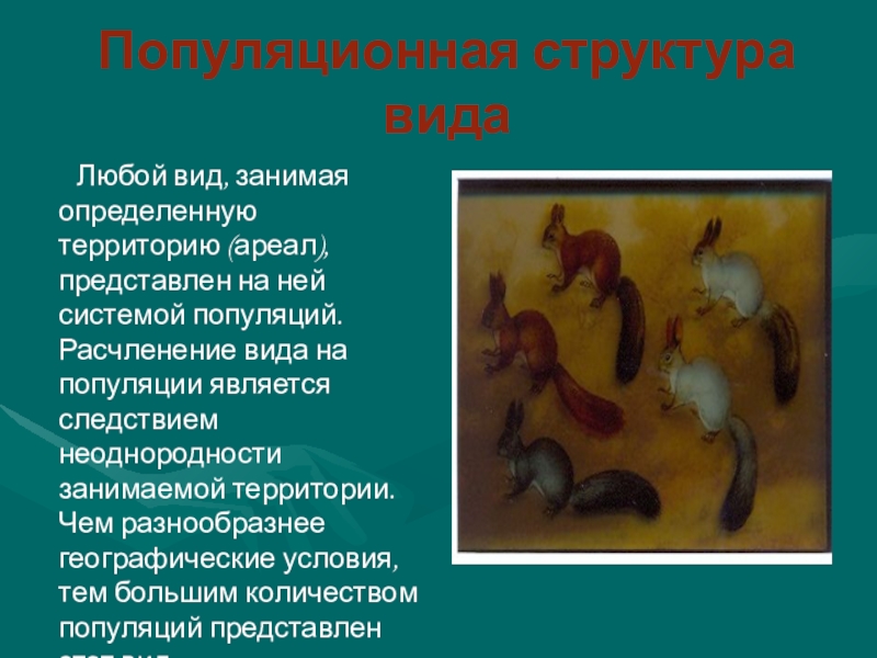 (ареал), представлен на ней системой популяций. Расчленение вида на популяции является следствием неоднородности занимаемой территории. Чем разнообразнее географические условия, тем большим количеством популяций представлен этот вид.