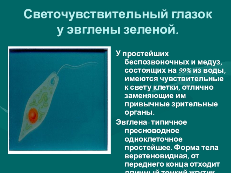 Эвглена- типичное пресноводное одноклеточное простейшее. Форма тела веретеновидная, от переднего конца отходит длинный тонкий жгутик. Вращая им, эвглена передвигаясь, как бы ввинчиваясь в воду. Имеет светочувствительный глазок красно-коричневого цвета.