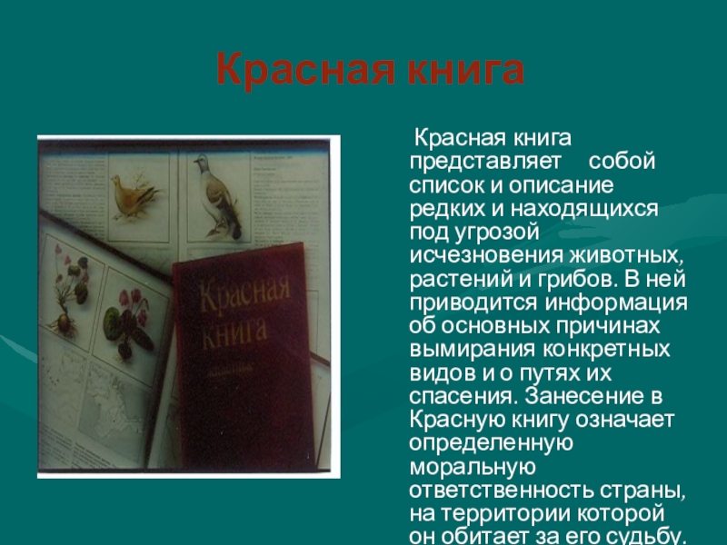 список и описание редких и находящихся под угрозой исчезновения животных, растений и грибов. В ней приводится информация об основных причинах вымирания конкретных видов и о путях их спасения. Занесение в Красную книгу означает определенную моральную ответственность страны, на территории которой он обитает за его судьбу.