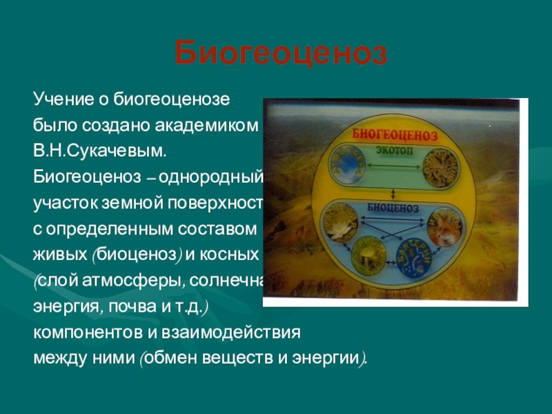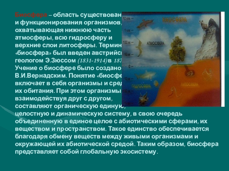 целостную и динамическую систему, в свою очередь объединенную в единое целое с абиотическими сферами, их веществом и пространством. Такое единство обеспечивается благодаря обмену веществ между живыми организмами и окружающей их абиотической средой. Таким образом, биосфера представляет собой глобальную экосистему.