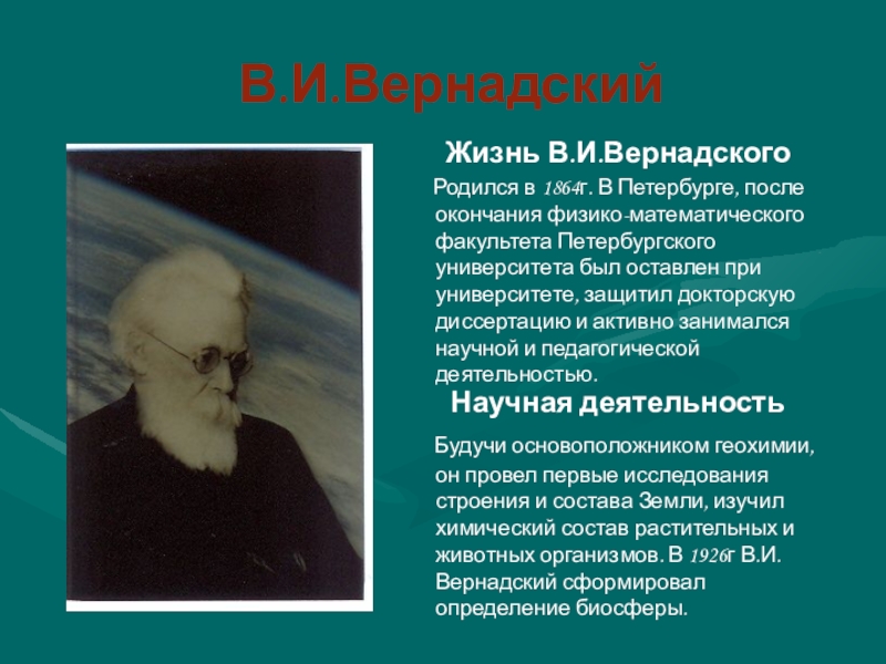 Будучи основоположником геохимии, он провел первые исследования строения и состава Земли, изучил химический состав растительных и животных организмов. В 1926г В.И.Вернадский сформировал определение биосферы.