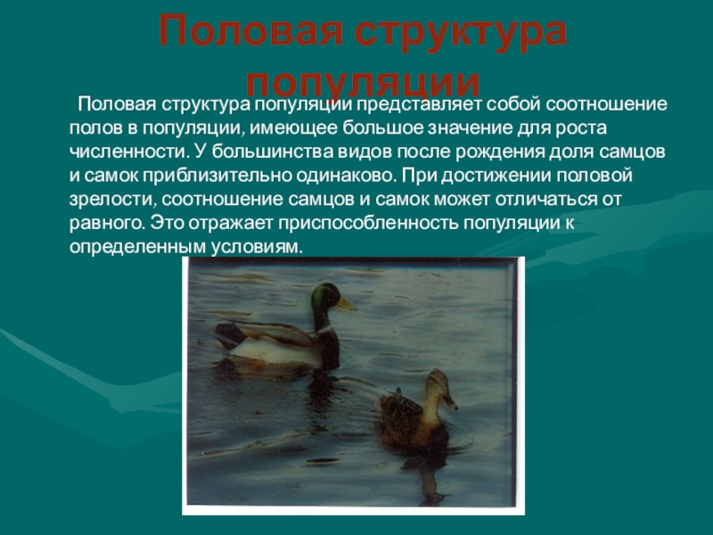 соотношение полов в популяции, имеющее большое значение для роста численности. У большинства видов после рождения доля самцов и самок приблизительно одинаково. При достижении половой зрелости, соотношение самцов и самок может отличаться от равного. Это отражает приспособленность популяции к определенным условиям.