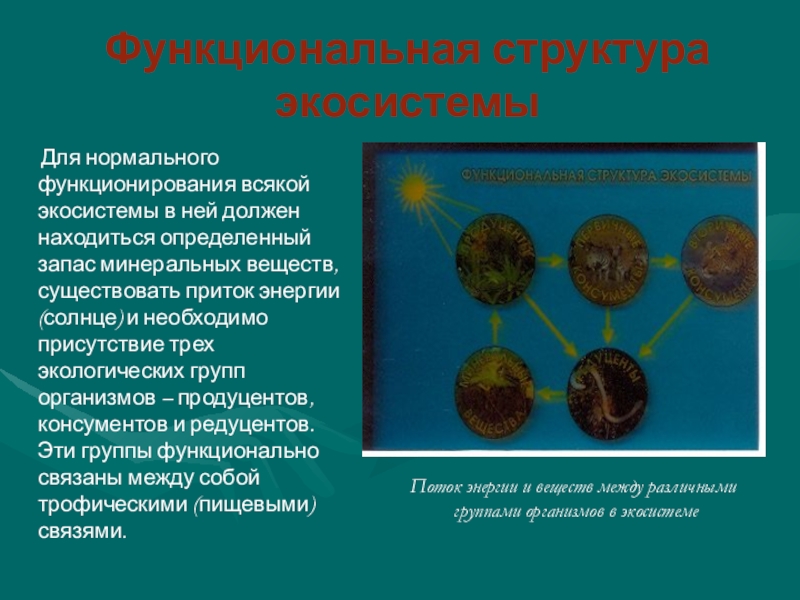 ней должен находиться определенный запас минеральных веществ, существовать приток энергии (солнце) и необходимо присутствие трех экологических групп организмов – продуцентов, консументов и редуцентов. Эти группы функционально связаны между собой трофическими (пищевыми) связями.