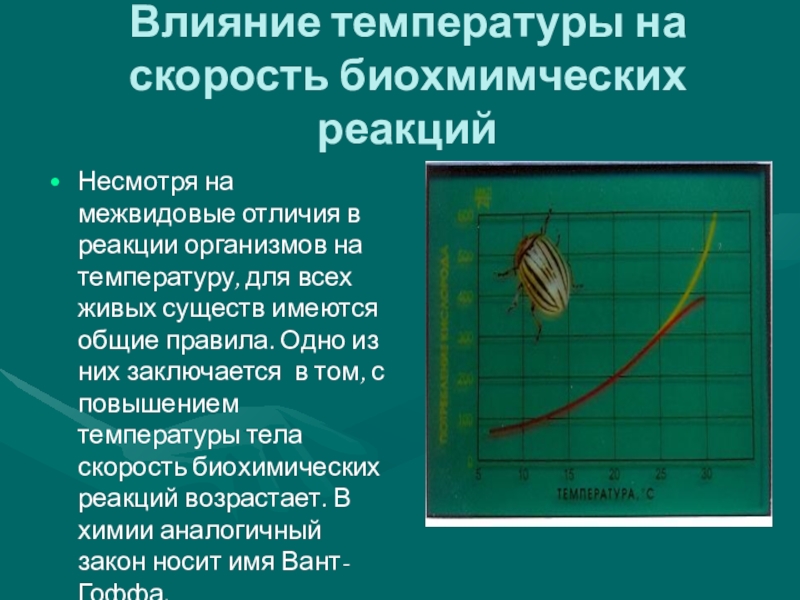 организмов на температуру, для всех живых существ имеются общие правила. Одно из них заключается в том, с повышением температуры тела скорость биохимических реакций возрастает. В химии аналогичный закон носит имя Вант-Гоффа.