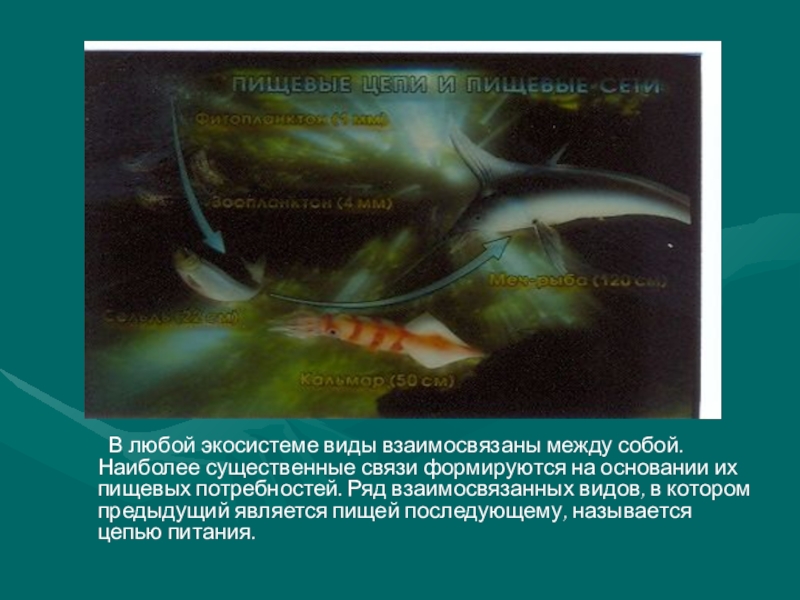 виды взаимосвязаны между собой. Наиболее существенные связи формируются на основании их пищевых потребностей. Ряд взаимосвязанных видов, в котором предыдущий является пищей последующему, называется цепью питания.