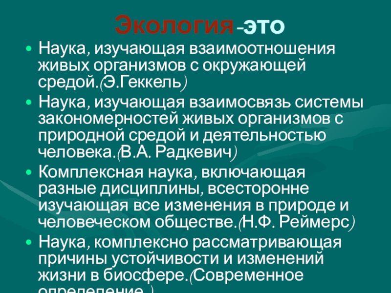 Комплексная наука, включающая разные дисциплины, всесторонне изучающая все изменения в природе и человеческом обществе.(Н.Ф. Реймерс)