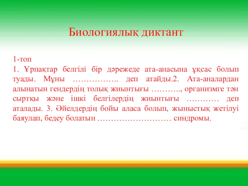 …………….. деп атайды.2. Ата-аналардан алынатын гендердің толық жиынтығы ……….., организмге тән сыртқы және ішкі белгілердің жиынтығы ………… деп аталады. 3. Әйелдердің бойы аласа болып, жыныстық жетілуі баяулап, бедеу болатын ……………………… синдромы.
