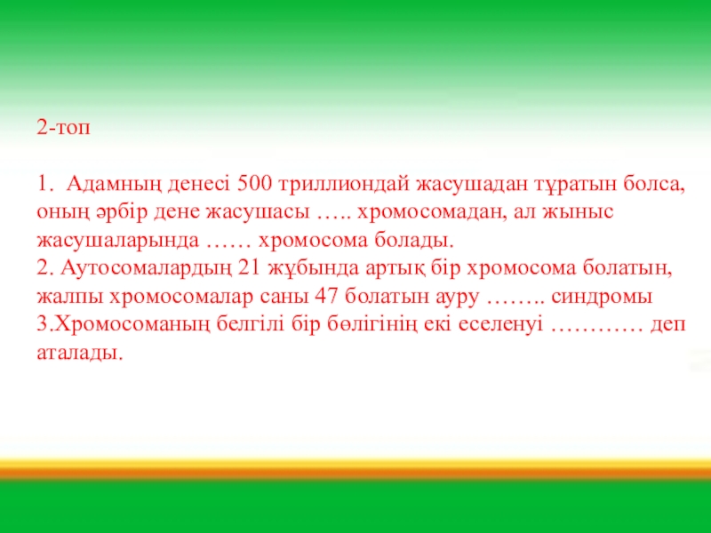 2. Аутосомалардың 21 жұбында артық бір хромосома болатын, жалпы хромосомалар саны 47 болатын ауру …….. синдромы