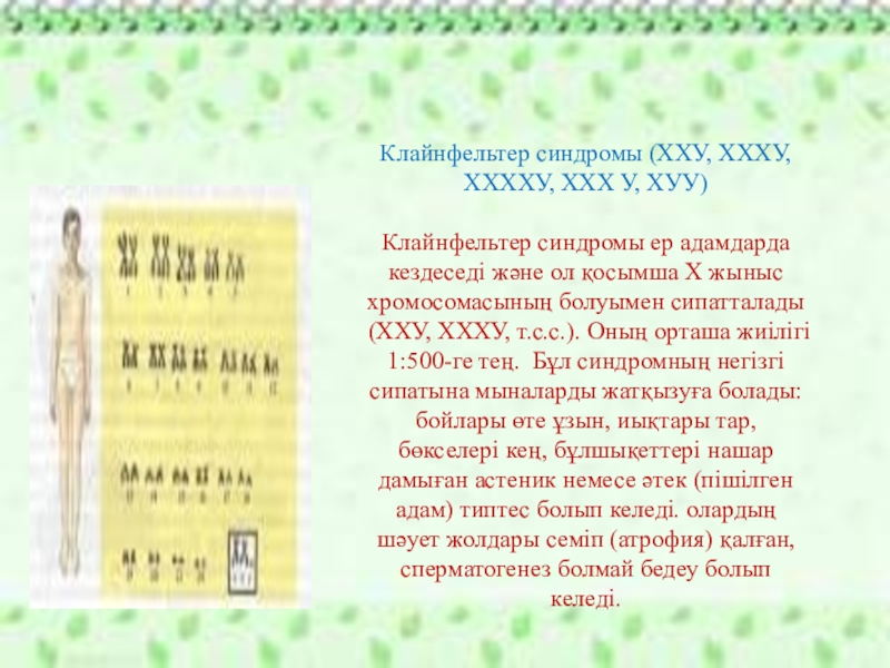 кездеседі және ол қосымша X жыныс хромосомасының болуымен сипатталады (ХХУ, ХХХУ, т.с.с.). Оның орташа жиілігі 1:500-ге тең. Бұл синдромның негізгі сипатына мыналарды жатқызуға болады: бойлары өте ұзын, иықтары тар, бөкселері кең, бұлшықеттері нашар дамыған астеник немесе әтек (пішілген адам) типтес болып келеді. олардың шәует жолдары семіп (атрофия) қалған, сперматогенез болмай бедеу болып келеді.