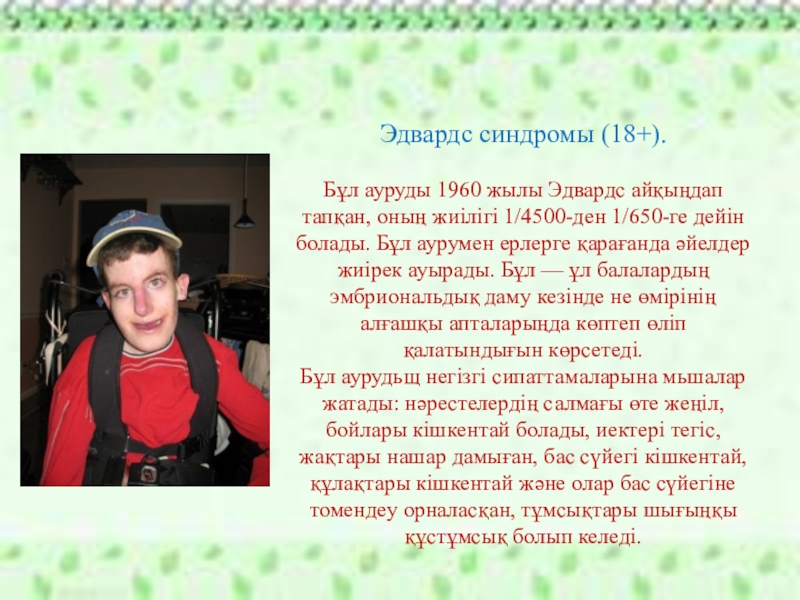 жазған. Бұл ауру екі жыныста да бірдей жиілікпен кездеседі, оның орташа жиілігі 1/700-дей шамасындай. Даун синдромының негізгі клиникалық сипаты — ақылесінің туа біте кем болуында. Бұл аурудың негізгі фенотиптік сипаттарына мыналарды жатқызуға болады; бойлары аласа, шүйдесі тегіс, бас сүйектері кішкентай трахицефальды, эпикант дамыған, көздері қысыңқы, мұрыңдарының түбі жалпақ, кең кеңсірікті болып келеді.