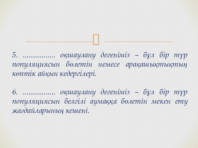 6. ................. оқшаулану дегеніміз – бұл бір түр популяциясын белгілі аумаққа бөлетін мекен ету жағдайларының кешені.