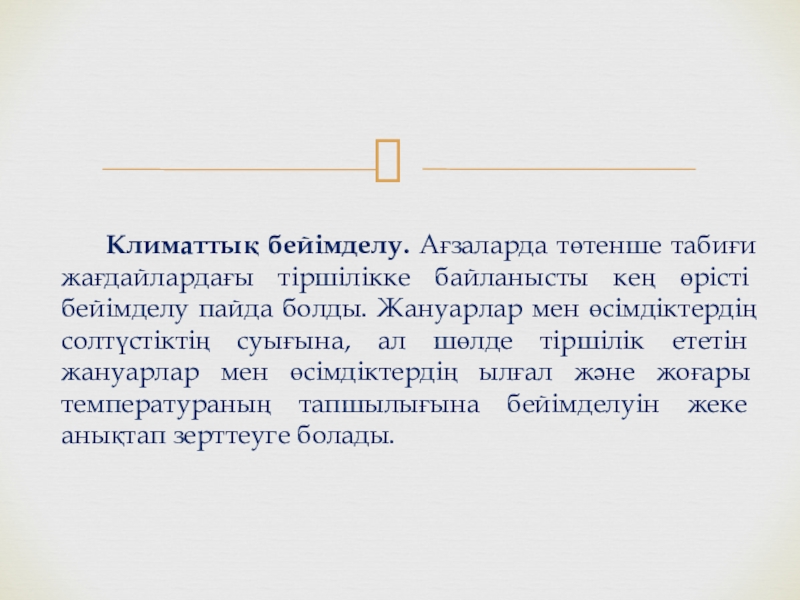 Слайд 14 Климаттық бейімделу. Ағзаларда төтенше табиғи жағдайлардағы тіршілікке байланысты