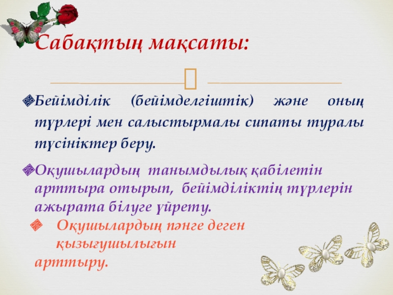 Оқушылардың танымдылық қабілетін арттыра отырып, бейімділіктің түрлерін ажырата білуге үйрету.