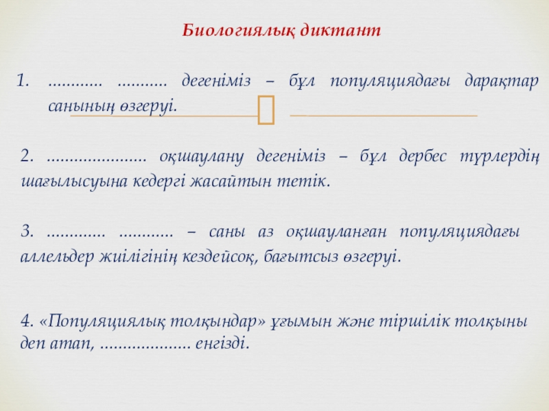 3. ............. ............ – саны аз оқшауланған популяциядағы аллельдер жиілігінің кездейсоқ, бағытсыз өзгеруі.