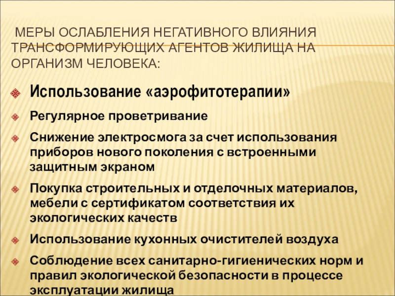 МЕРЫ ОСЛАБЛЕНИЯ НЕГАТИВНОГО ВЛИЯНИЯ ТРАНСФОРМИРУЮЩИХ АГЕНТОВ ЖИЛИЩА НА ОРГАНИЗМ ЧЕЛОВЕКА:
