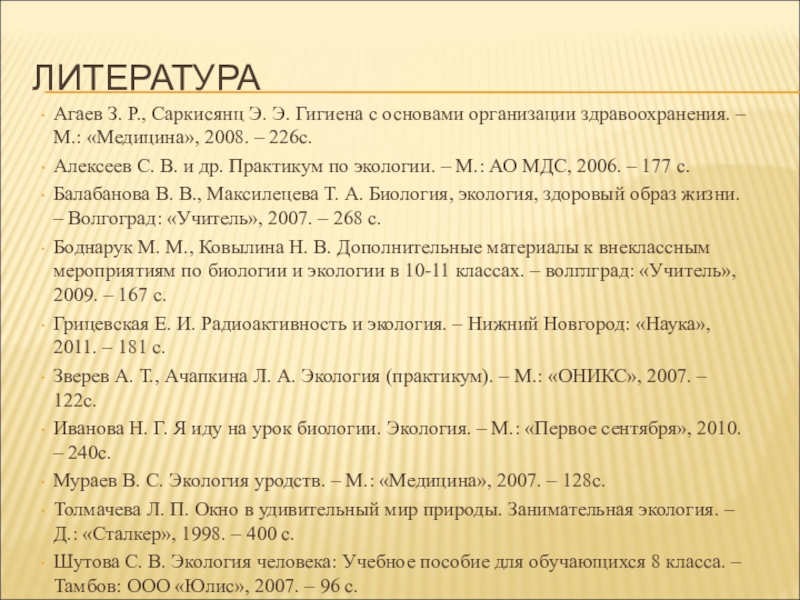 Балабанова В. В., Максилецева Т. А. Биология, экология, здоровый образ жизни. – Волгоград: «Учитель», 2007. – 268 с.