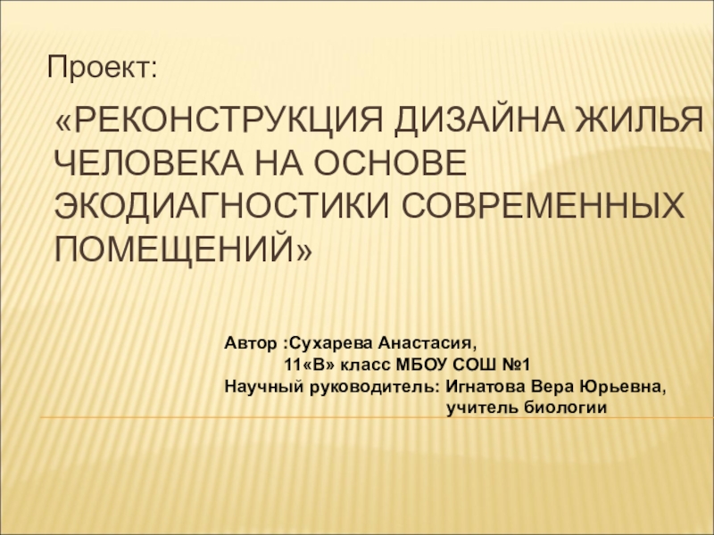 Слайд 1«РЕКОНСТРУКЦИЯ ДИЗАЙНА ЖИЛЬЯ ЧЕЛОВЕКА НА ОСНОВЕ ЭКОДИАГНОСТИКИ СОВРЕМЕННЫХ ПОМЕЩЕНИЙ»