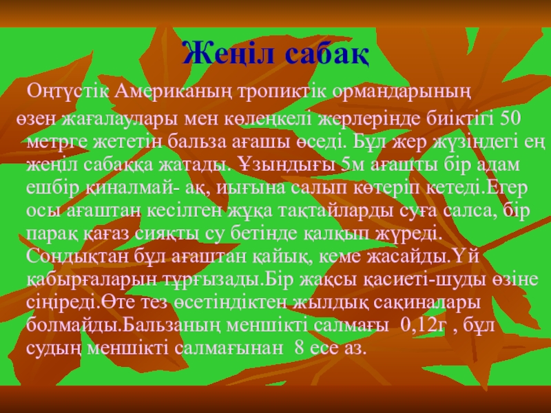 жерлерінде биіктігі 50 метрге жететін бальза ағашы өседі. Бұл жер жүзіндегі ең жеңіл сабаққа жатады. Ұзындығы 5м ағашты бір адам ешбір қиналмай- ақ, иығына салып көтеріп кетеді.Егер осы ағаштан кесілген жұқа тақтайларды суға салса, бір парақ қағаз сияқты су бетінде қалқып жүреді. Сондықтан бұл ағаштан қайық, кеме жасайды.Үй қабырғаларын тұрғызады.Бір жақсы қасиеті-шуды өзіне сіңіреді.Өте тез өсетіндіктен жылдық сақиналары болмайды.Бальзаның меншікті салмағы 0,12г , бұл судың меншікті салмағынан 8 есе аз.