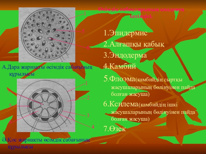 Слайд 20Өсімдік сабақтарының көлденең кесіндісі.