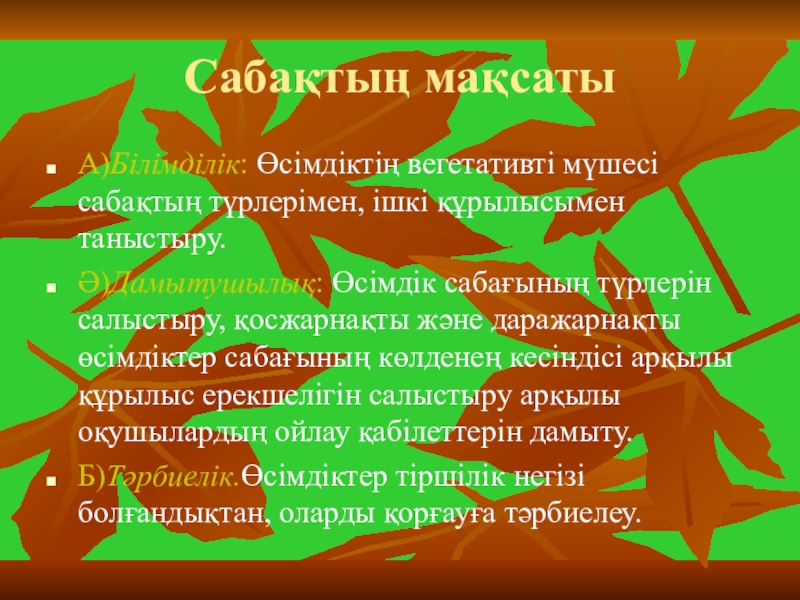 А)Білімділік: Өсімдіктің вегетативті мүшесі сабақтың түрлерімен, ішкі құрылысымен таныстыру.