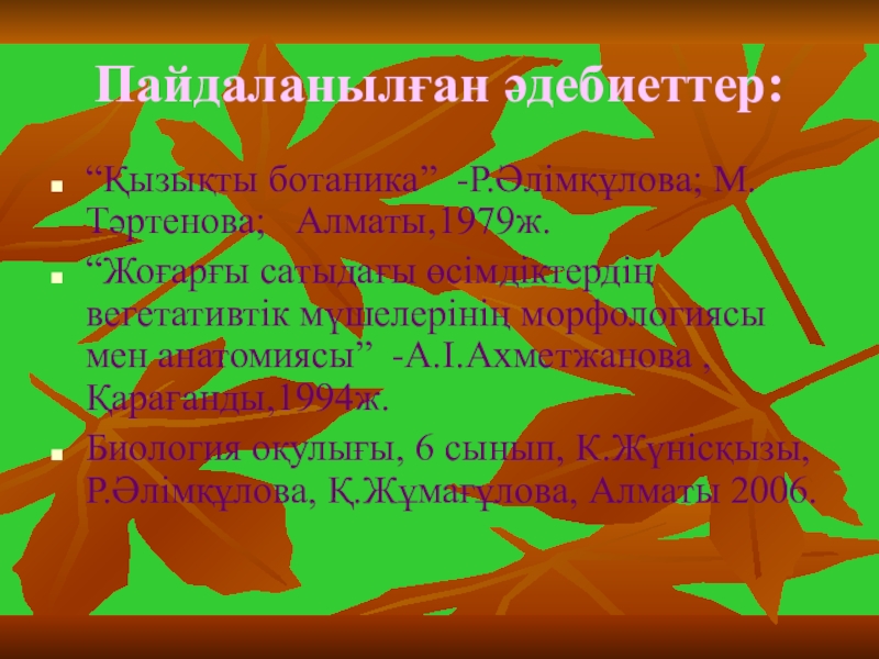 “Қызықты ботаника” -Р.Әлімқұлова; М.Тәртенова; Алматы,1979ж.
