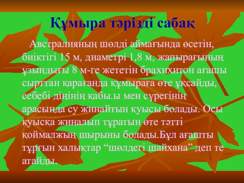 м, диаметрі 1,8 м, жапырағының ұзындығы 8 м-ге жететін брахихитон ағашы сырттан қарағанда құмыраға өте ұқсайды, себебі діңінің қабы.ы мен сүрегінің арасында су жинайтын қуысы болады. Осы қуысқа жиналып тұратын өте тәтті қоймалжың шырыны болады.Бұл ағашты тұрғын халықтар “шөлдегі шайхана” деп те атайды.