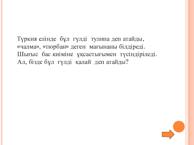 деген мағынаны білдіреді. Шығыс бас киіміне ұқсастығымен түсіндіріледі. Ал, бізде бұл гүлді қалай деп атайды?