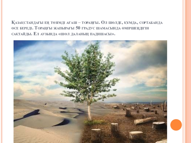 Қазақстандағы ең төзімді ағаш – тораңғы. Ол шөлде, құмда, сортабанда өсе