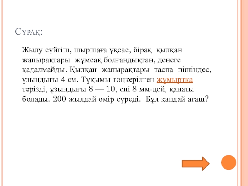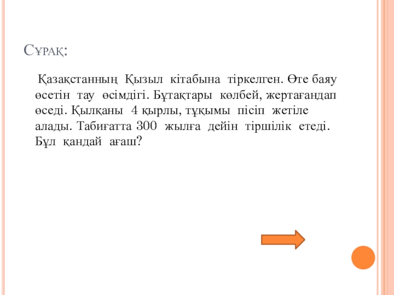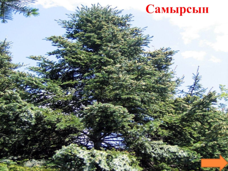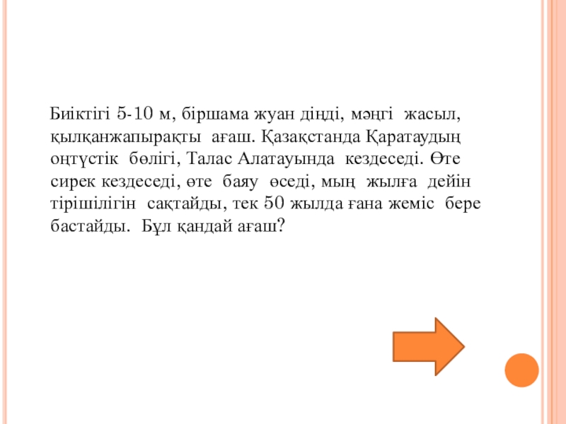 Слайд 4 Биіктігі 5-10 м, біршама жуан діңді, мәңгі жасыл, қылқанжапырақты