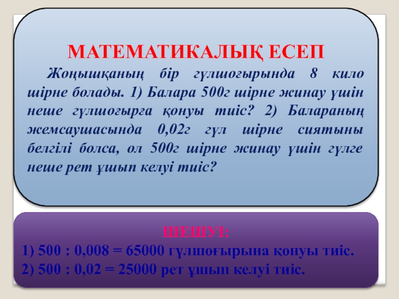 1) 500 : 0,008 = 65000 гүлшоғырына қонуы тиіс.