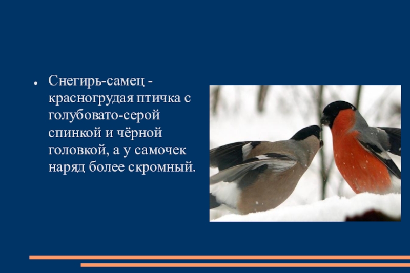 Снегирь-самец - красногрудая птичка с голубовато-серой спинкой и чёрной головкой, а