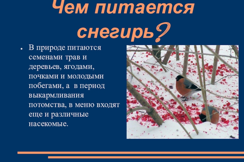 Чем питается снегирь?В природе питаются семенами трав и деревьев, ягодами, почками и молодыми побегами, а в период