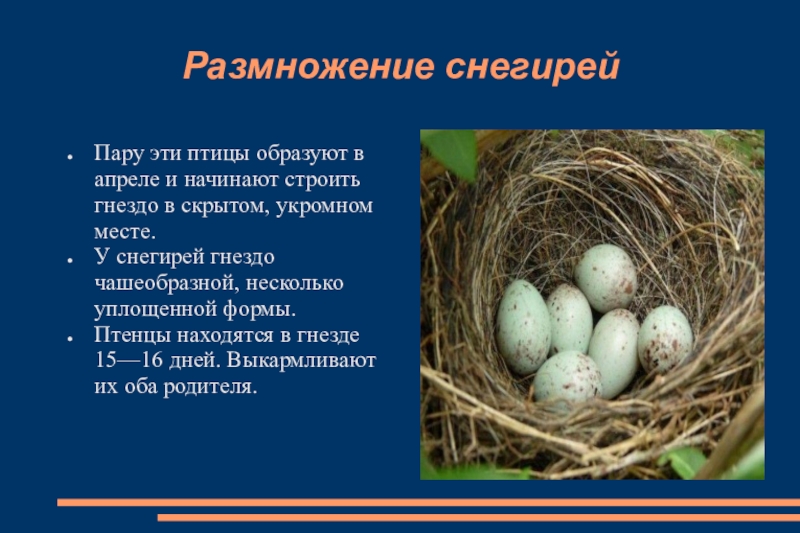 Размножение снегирейПару эти птицы образуют в апреле и начинают строить гнездо в скрытом, укромном месте.У снегирей гнездо