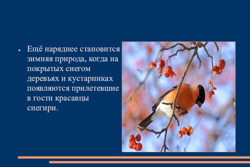 Ещё наряднее становится зимняя природа, когда на покрытых снегом деревьях и кустарниках появляются прилетевшие в гости красавцы