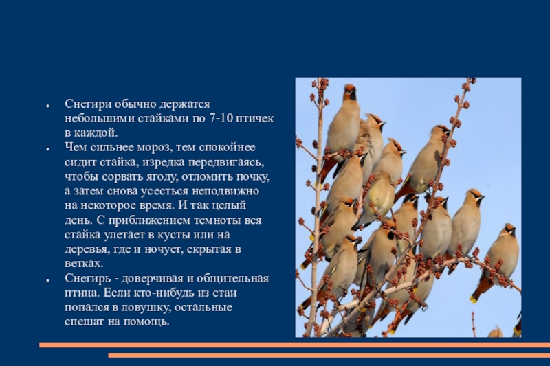 Снегири обычно держатся небольшими стайками по 7-10 птичек в каждой.Чем сильнее мороз, тем спокойнее сидит стайка, изредка