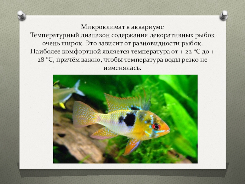 Слайд 8Микроклимат в аквариуме Температурный диапазон содержания декоративных рыбок очень широк. Это зависит
