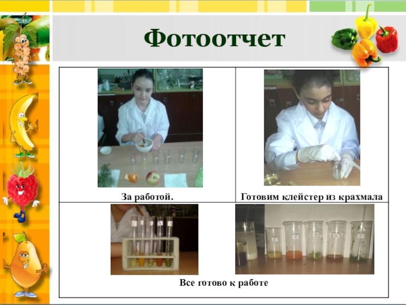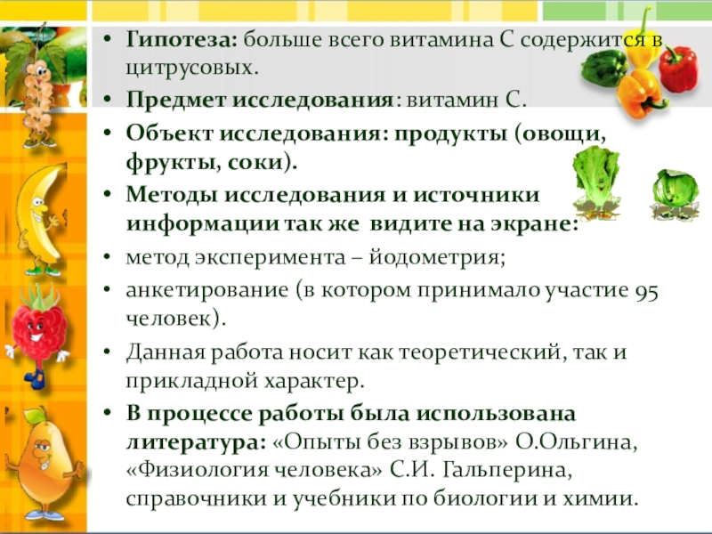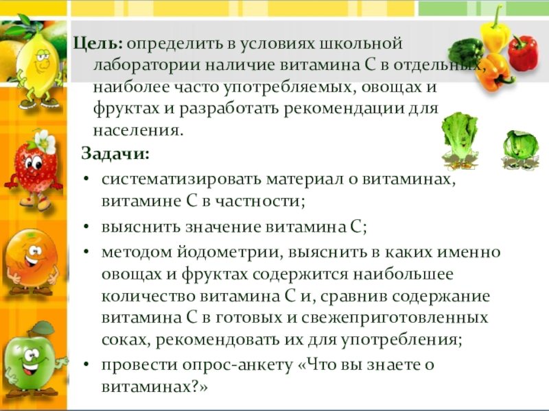 Цель: определить в условиях школьной лаборатории наличие витамина С в отдельных, наиболее часто употребляемых, овощах и фруктах и разработать рекомендации для населения.
