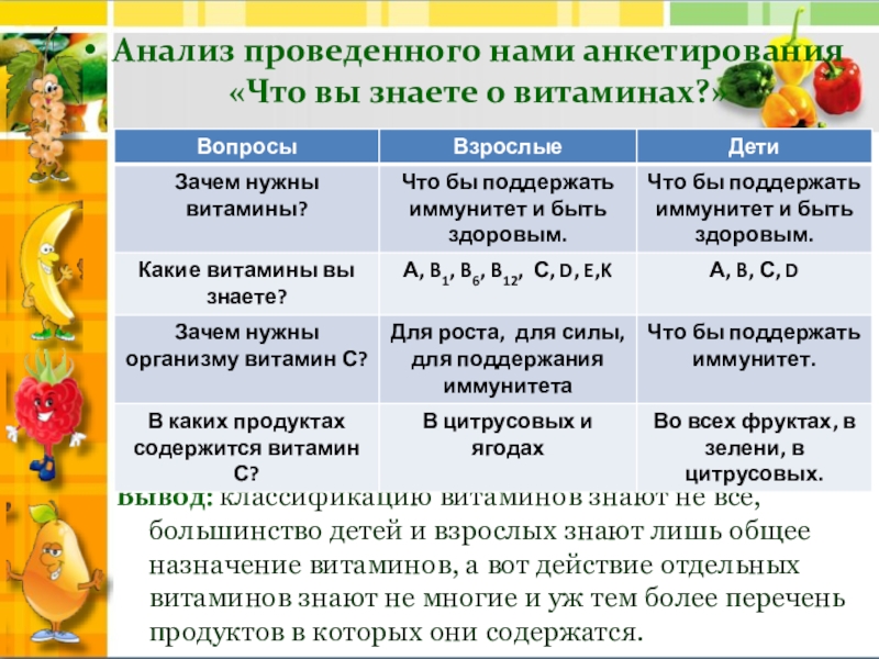 Слайд 4Анализ проведенного нами анкетирования «Что вы знаете о витаминах?»