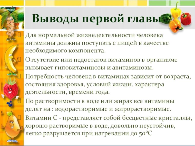 Слайд 16Вывод: с течением времени во многих продуктах содержание витамина С уменьшается,