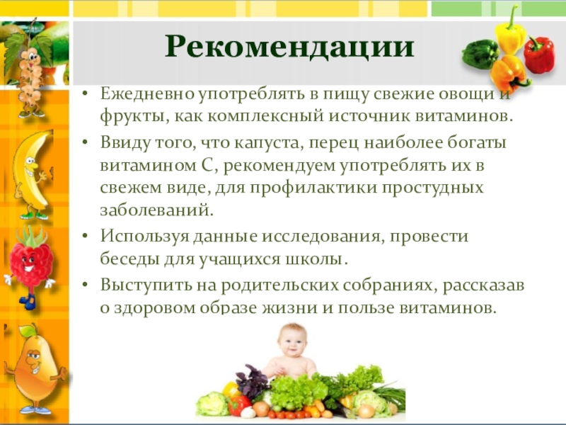 Ввиду того, что капуста, перец наиболее богаты витамином С, рекомендуем употреблять их в свежем виде, для профилактики простудных заболеваний.
