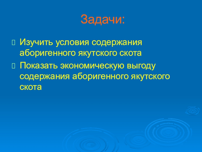 Задачи:Изучить условия содержания аборигенного якутского скотаПоказать экономическую выгоду содержания аборигенного якутского скота