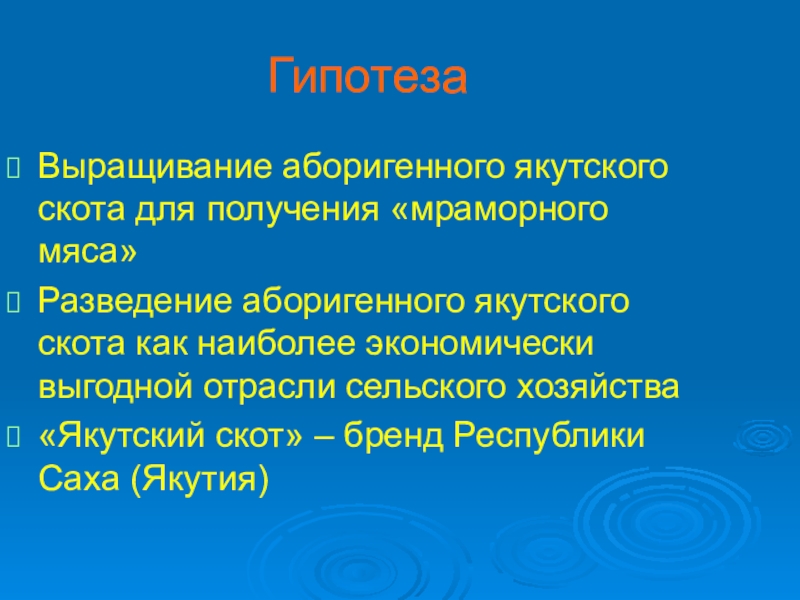 ГипотезаВыращивание аборигенного якутского скота для получения «мраморного мяса»Разведение аборигенного якутского скота как наиболее экономически выгодной отрасли сельского