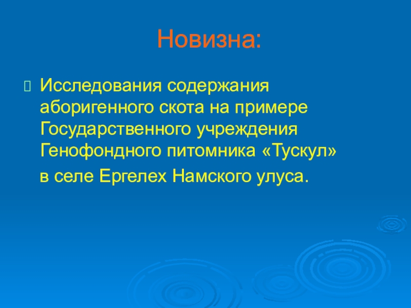 Новизна:Исследования содержания аборигенного скота на примере Государственного учреждения Генофондного питомника «Тускул»  в селе Ергелех Намского улуса.