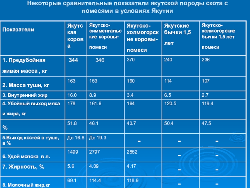 Слайд 9Некоторые сравнительные показатели якутской породы скота с помесями в условиях Якутии